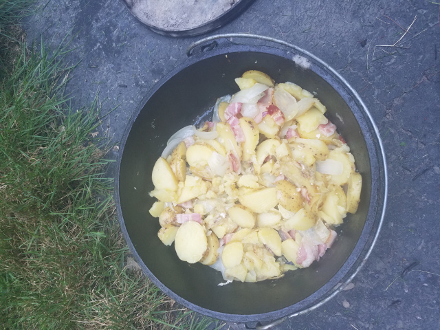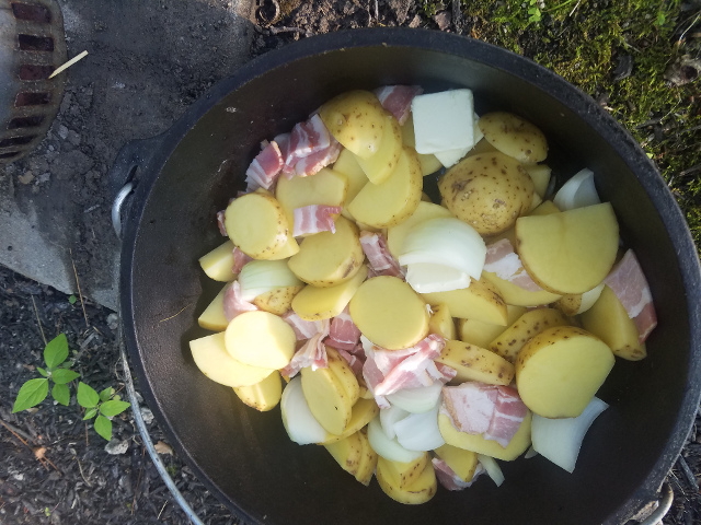 Cut bacon into 1/2" pieces, put into Dutch Oven. If bacon is fatty, cook and discard fat. Cut potatoes and onion into smaller pieces. The potatoes need to be washed, but don't need to be peeled. Place in Dutch oven with cubed butter.